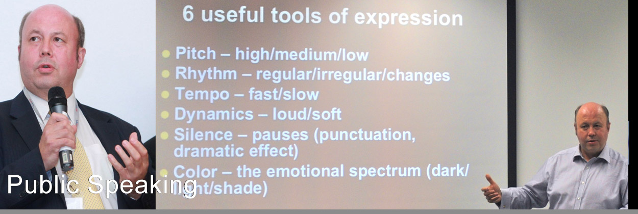 Public Speaking focuses on the vocal and expressive side of a presentation, and it is naturally linked to the training for Presentation Skills which focuses on the motivational and logical side of a presentation. The preparation of a speech or a presentation, includes pacing, subdivision, style, how one relates to the audience, and how one handles performance pressure. [See: Performance Coaching]