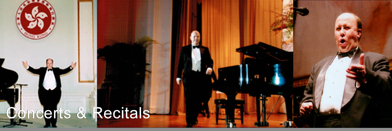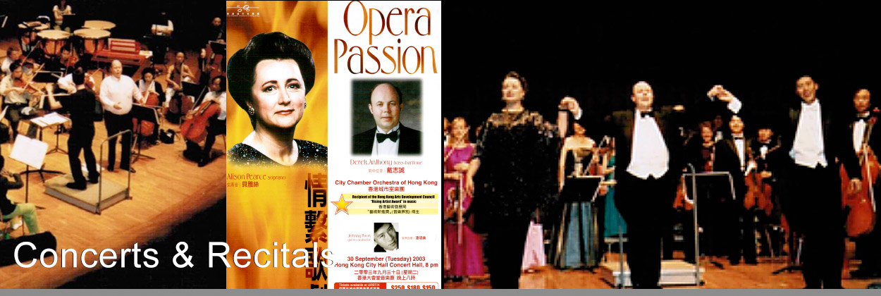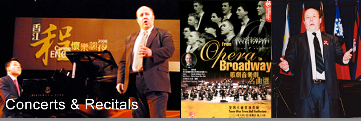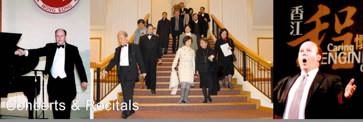 1: Fundraising Performance at Hong Kong Polytechnic University’s Jockey Club Auditorium for Hong Kong Engineer’s Scholarship Fund, accompanied by Juillard graduate, Ernest So 2: Opera and Broadway solos with The Hong Kong Sinfonietta and a visiting US-choir 3: Performing Verdi’s ‘O tu, Paermo’ at Hong City Hall in 2002, at the International Memorial for Peace for 9/11 arranged by the American Chamber of Commerce in Hong Kong.