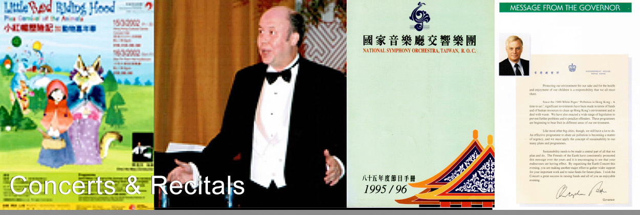 1: Dr. Anthony performs The Big Bad Wolf in Seymour Barab’s opera “Little Red Riding Hood” with the Hong Kong Philharmonic Orchestra to over 2,000 children. 2: Performing “If I were a rich man” at a Fundraising Event at the Hong Kong University for its prestigious Museum Society. 3: Dr. Derek Anthony performs the bass solo in Mahler’s 8th Symphony for Taiwan’s National Day celebrations in 1995, at the National Concert Hall in Taipei, Taiwan 4: Message from the last Governor of Hong Kong, Lord Christopher Patten for a Fundraising Concert at Government House